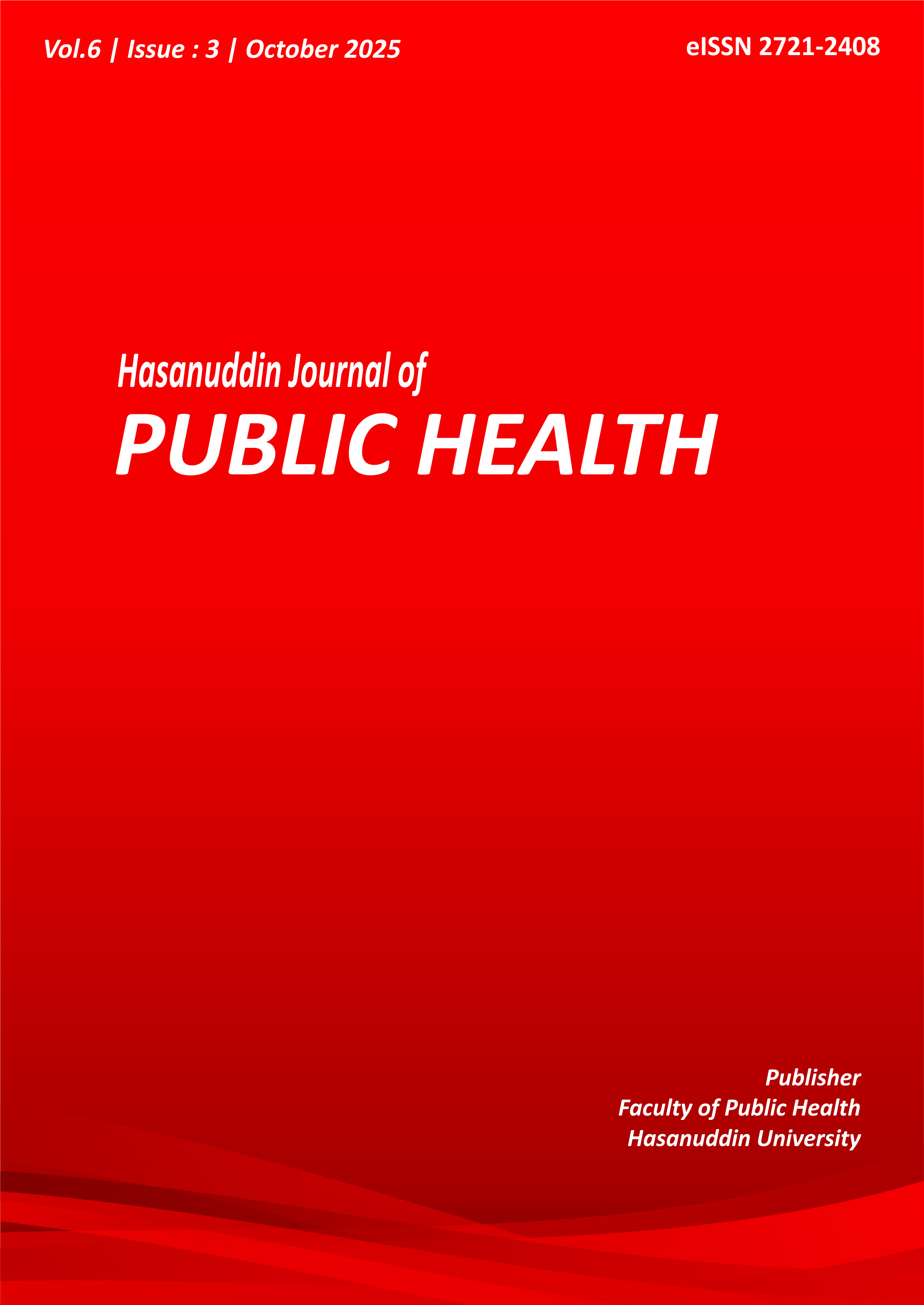 Hasanuddin Journal of Public Health is a periodical scientific journal published by the Faculty of Public Health, Hasanuddin University since 2020, with eISSN 2721-2408. Hasanuddin Journal of Public Health accepts scientific papers in the form of research reports (original article research papers) with focus and scope including: Epidemiology, Health Education and Promotion, Environmental Health, Occupational Health and Safety, Health Administration and Policy, Biostatistics, Reproductive Health, Hospital Management, Nutrition Sciene, Health Information System.