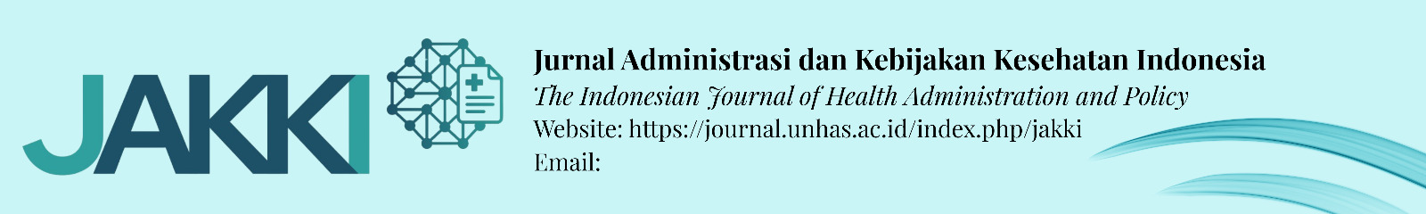 The Journal of Health Administration and Policy Indonesia (JAKKI) is a peer-reviewed academic journal published by the Department of Health Administration and Policy, Faculty of Public Health, Hasanuddin University. Established in 2012, JAKKI aims to disseminate high-quality scientific knowledge that supports the development of health administration, health policy, and health system governance in Indonesia and beyond.