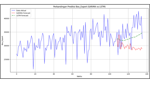 Abstract: Accurate forecasting of container throughput is vital for enhancing strategic planning and operational efficiency in seaport management. This study compares the performance of two time series forecasting models Seasonal Autoregressive Integrated Moving Average (SARIMA) and Long Short-Term Memory (LSTM) in predicting container throughput at Tanjung Emas Port, Semarang, Indonesia. Monthly throughput data from January 2014 to April 2025 were preprocessed using stationarity transformation and normalization techniques. Model performance was evaluated using Mean Absolute Percentage Error (MAPE), Root Mean Squared Error (RMSE), and Mean Absolute Error (MAE). The SARIMA model effectively captured seasonal patterns and produced accurate short-term forecasts. Conversely, the LSTM model exhibited notable significant deviation from the actual data , indicating lower predictive performance in this context. The findings indicate that SARIMA currently provides a more reliable forecasting approach for the port. Future research should consider hybrid models (e.g., SARIMA-LSTM) and incorporate exogenous variables to improve forecasting accuracy and support data-driven decision-making in port operations.