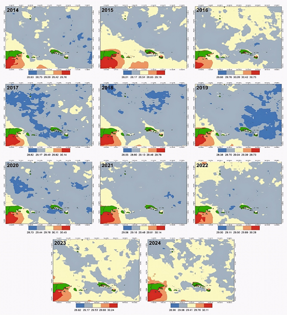 Indonesia’s marine environment is highly sensitive to global climate variability, particularly El Niño–Southern Oscillation (ENSO) and the Indian Ocean Dipole (IOD). This study analyzes the spatial and temporal variability of sea surface temperature (SST) and chlorophyll-a concentration and their relationship with ENSO and IOD in Sumenep waters, Madura Island. SST and chlorophyll-a data were derived from Aqua MODIS satellite observations for the period 2014–2024, while ENSO and IOD were represented by the Oceanic Niño Index (ONI) and Dipole Mode Index (DMI). Data were analyzed using temporal trend analysis, spatial mapping, and Pearson correlation. The results show that SST fluctuated between 28.01 and 30.75 °C, with higher temperatures during El Niño phases and lower temperatures during La Niña phases. Chlorophyll-a exhibited relatively stable minimum values (0.178–0.217 mg/m³), while maximum values varied between 0.499 and 0.782 mg/m³, peaking in 2020. Pearson correlation analysis indicates a strong relationship between ENSO and SST (r = 0.791) and a very strong relationship with chlorophyll-a (r = 0.898). In contrast, IOD shows very weak correlations with SST (r = 0.074) and chlorophyll-a (r = 0.211). These findings confirm that ENSO is the dominant driver of SST and chlorophyll-a variability in Sumenep waters, with important implications for regional marine productivity.
