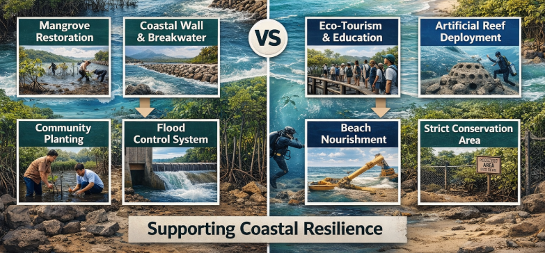 Mangrove and coastal ecosystems play a critical role in enhancing coastal resilience; however, their effectiveness strongly depends on governance arrangements and management strategies. This study applies a qualitative comparative case study approach integrating a Systematic Literature Review (SLR) and field observations to compare mangrove and coastal ecosystem management strategies in Padang City (Indonesia) and Port Dickson (Malaysia). A structured comparative framework was used to assess biophysical conditions, governance structures, monitoring capacity, community participation, and contributions to ecological, institutional, and social resilience. The results indicate that Padang City possesses larger mangrove extent and higher species diversity, supporting stronger ecological and social resilience, but is constrained by fragmented governance and weak enforcement. Port Dickson exhibits smaller and fragmented mangrove areas with clearer institutional authority and periodic monitoring, yet limited social–ecological integration. The findings highlight that effective coastal resilience requires integrating strong regulatory frameworks, community engagement, and consistent long-term monitoring.